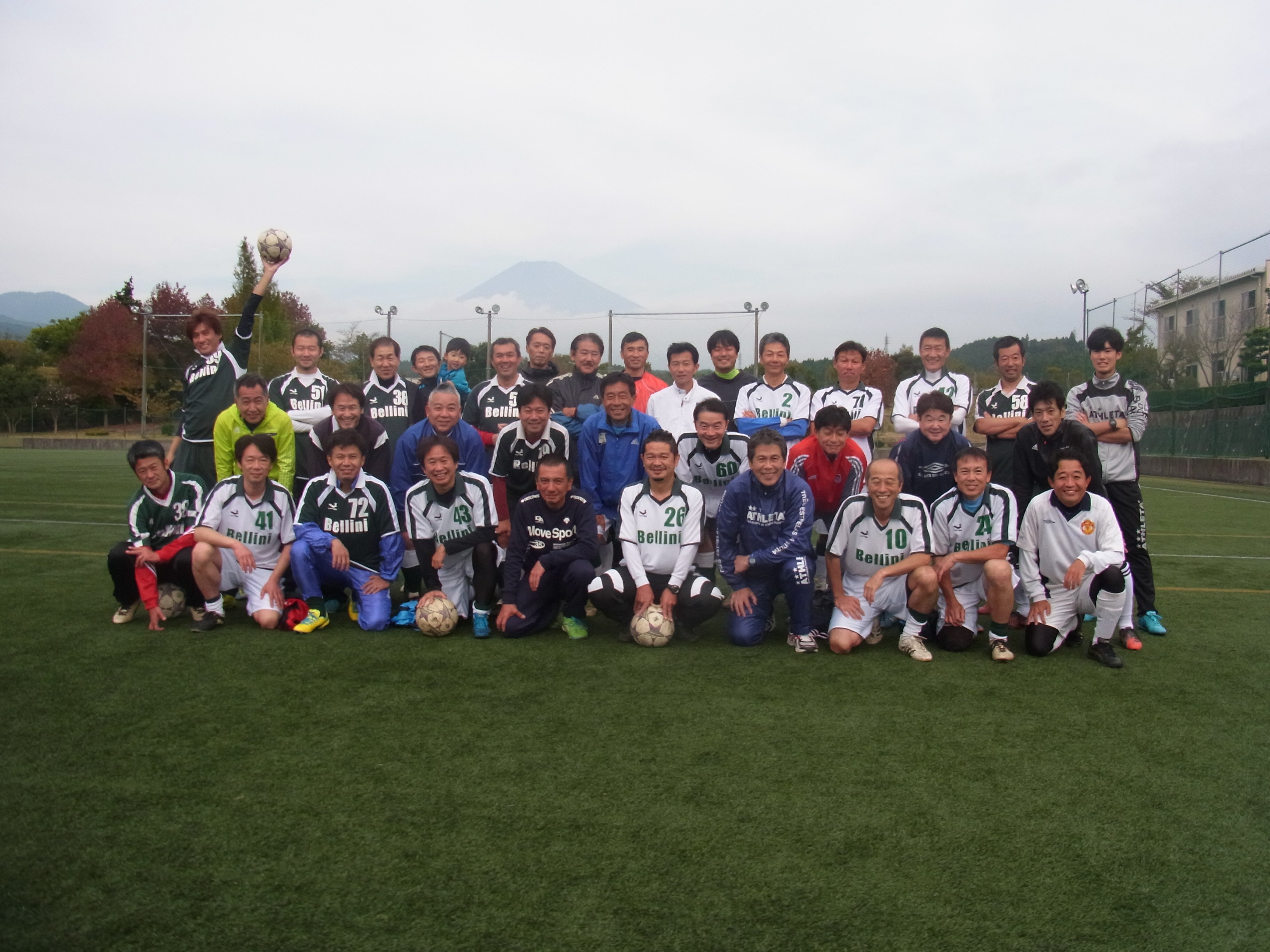 秋晴れのもと、富士山を眺めながら、おっさんたちがボール蹴りにうつつを抜かし、